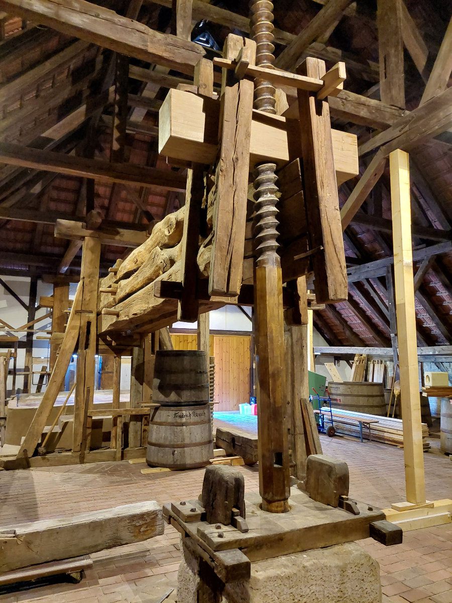 Ein seltenes technikgeschichtliches Ereignis: Schaupressen auf einer 400 Jahre alten Baumpresse – Kelterbaum oder Torkel - in Metzingen-Neuhausen