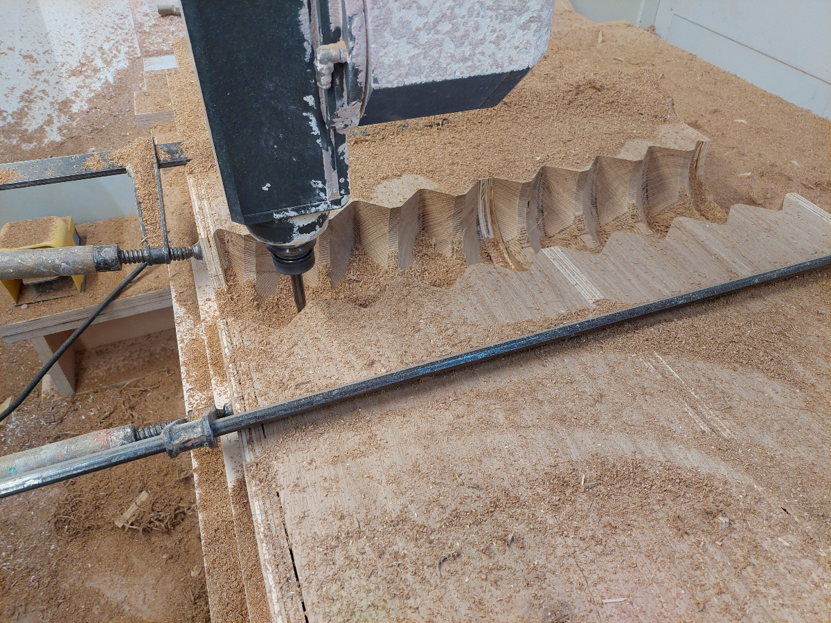 Mit Hilfe von örtlichen Handwerkern (Zimmerei Bärmann und Modellbau Trost) wurde die Geometrie des Gewindes mit einem Scanner erfasst und die Mutter aus 2 Eiche Halbschalen im Fräsverfahren neu hergestellt, so wurde historische Handwerkskunst durch Hightech nachgeahmt.
